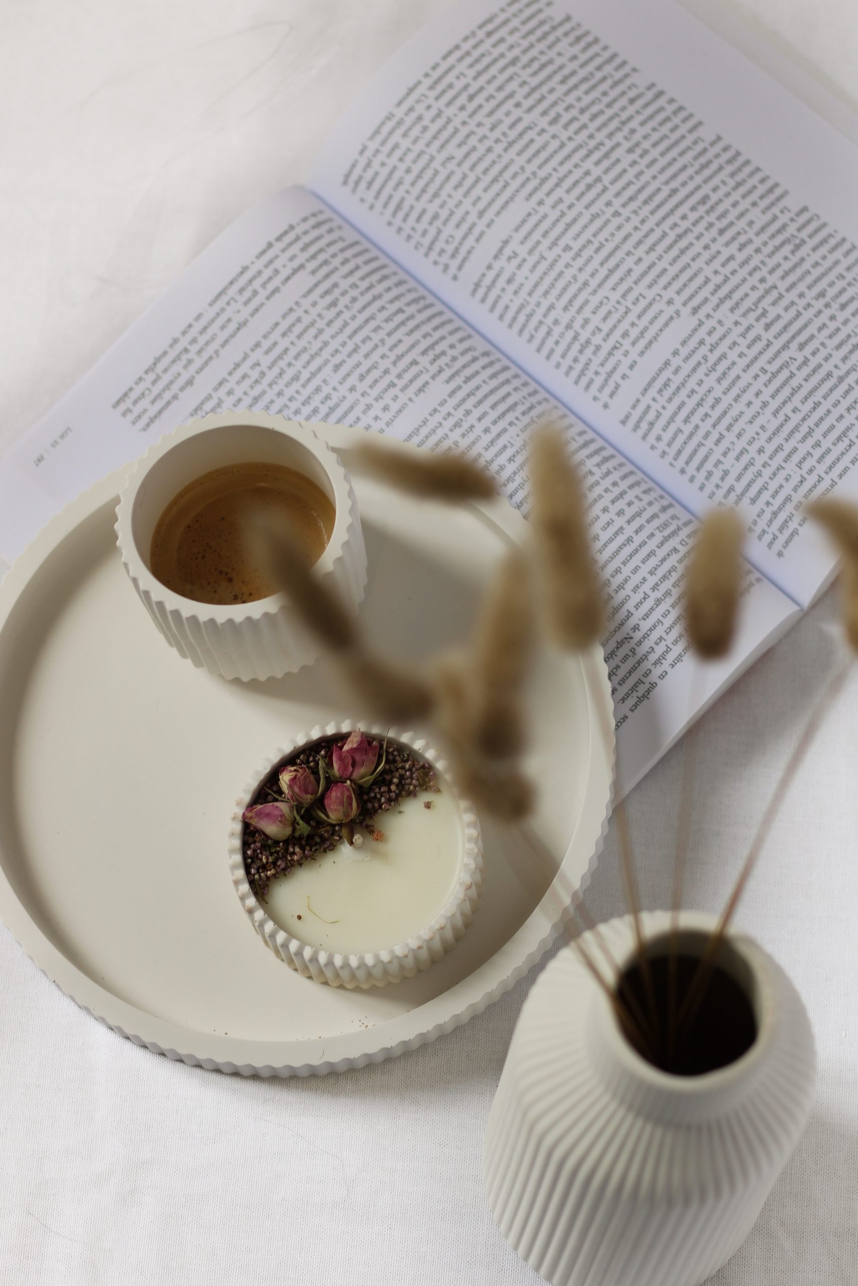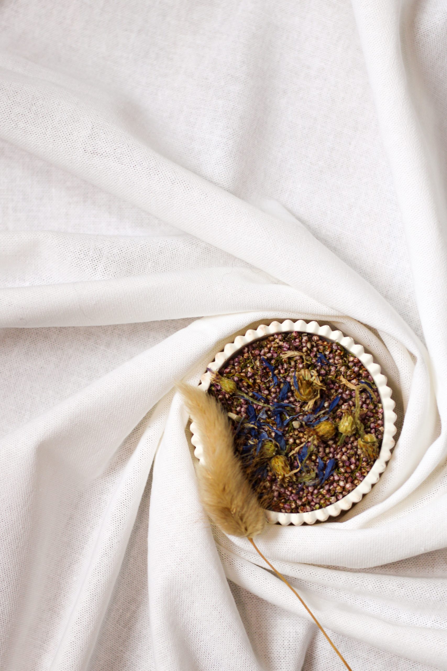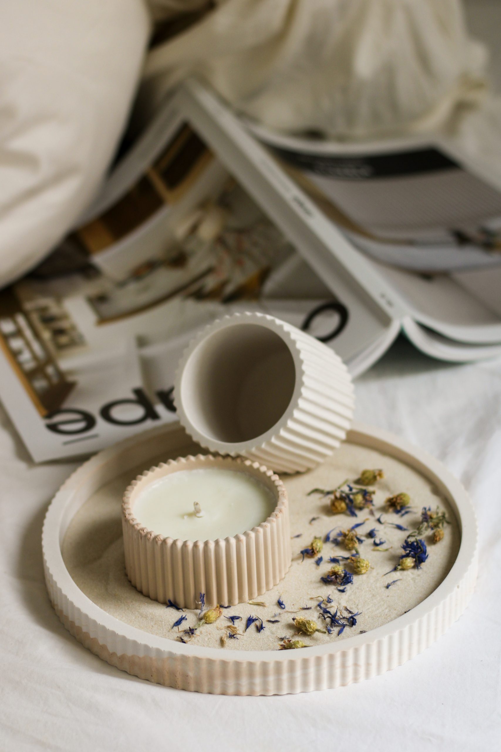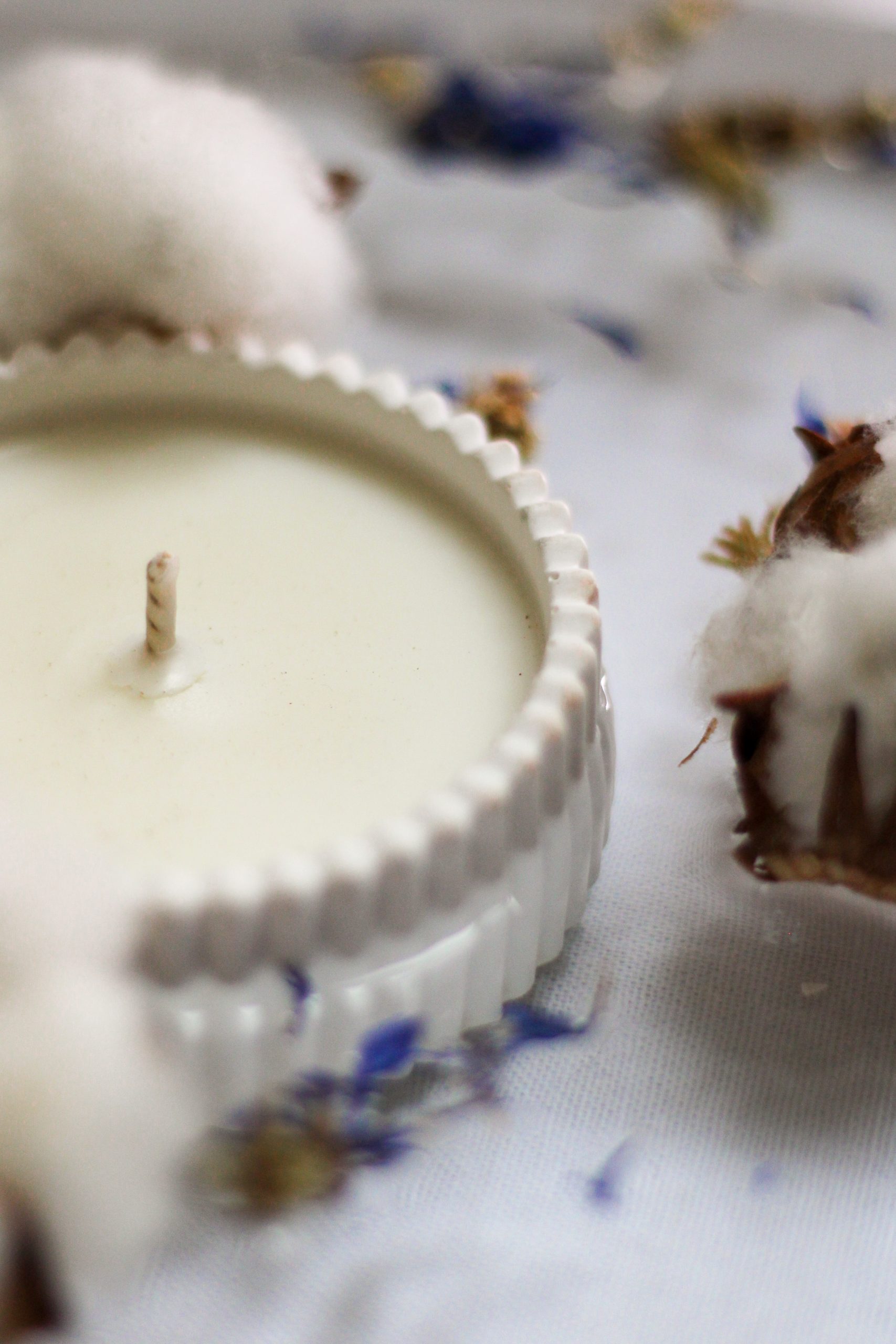 Bougie à la cire de soja et au parfum “fleur de lin” dans un pot en plâtre