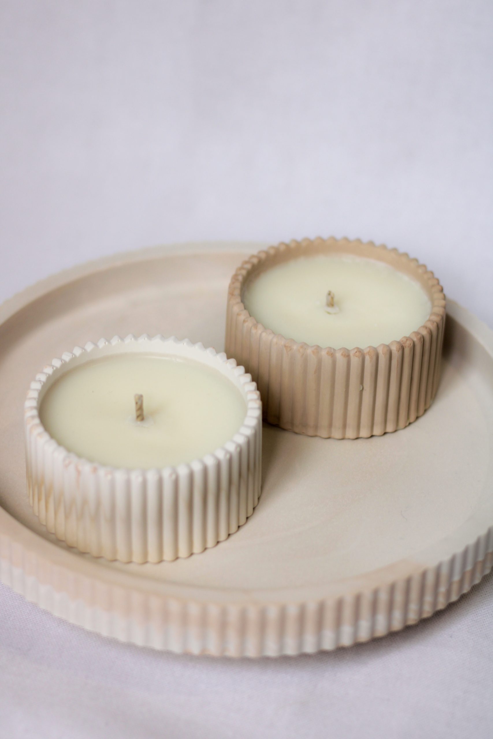 Bougie à la cire de soja et au parfum “coton” dans un pot en plâtre